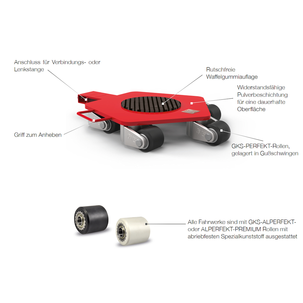 Zwei, drei oder vier Fahrwerke lassen sich flexibel miteinander kombinieren – für zusätzliche Stabilität oder größere Lastaufnahmen. Dank passgenauer Verbindungs- und Lenkstangen behalten Sie mühelos die Kontrolle, auch bei komplexen Transportaufgaben. Optional sind sie auch mit anderen GKS-Fahrwerken aus den Serien L, F und TL kombinierbar – für maximal flexible Einsatzszenarien.